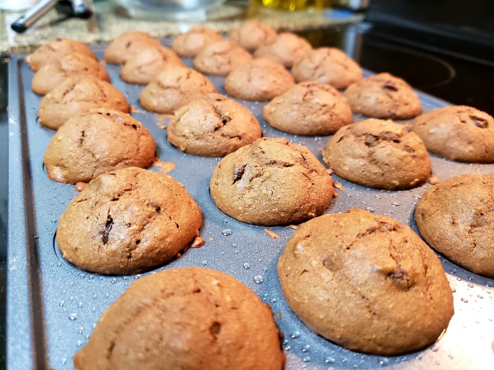I didn’t make too many changes. I followed the recipe almost exactly, but added 1/4 cup of oats (plus a smidge more of liquid, maybe like 2 tablespoons more), blended in 1/2 cup of Birch Bender’s paleo pancake mix, an extra 1.5 Tablespoons of sugar because of the oats, and instead of 4 ounces of chocolate chips total, I added 6 in total, so there were more chips in the muffins. It was very chocolate-y and delicious. Being someone who isn’t a big sweets fan, I really like how “light” these muffins are. Its perfect for breakfast, and to wash down and drinks you make like coffee or tea. It’s totally fine as a standalone quick bite too.