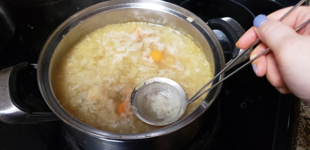 If I could recooked this, I would par-boil the chicken first to get rid of impurities instead of doing it with all the onions, garlic, and ginger added in, it made it very hard to take out the rising foam and scum that built on the top…. plus, I didn’t julienne the onions, I just diced them small to save time and so I wouldn’t have chunky onions if there was a chance.